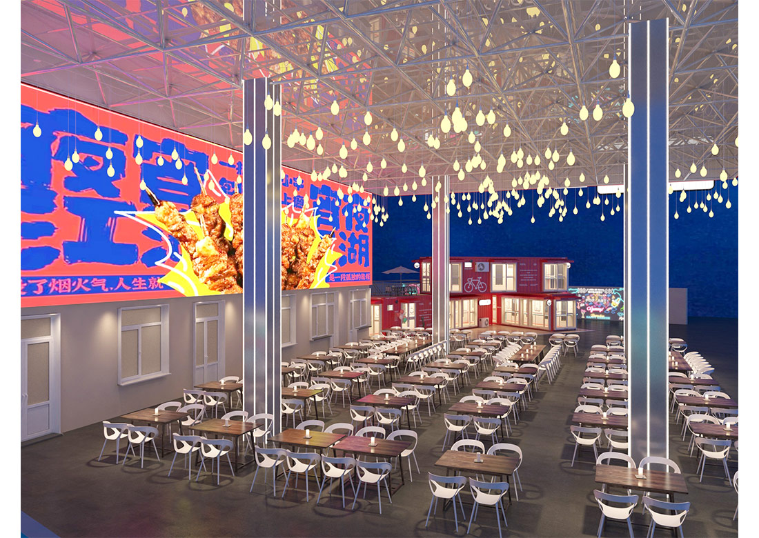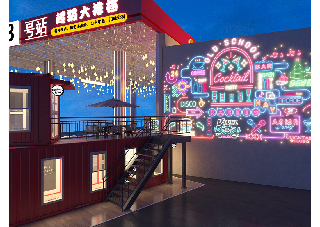 集裝箱大排檔裝修效果圖展現(xiàn)出了各種元素相互碰撞從而打造出完美融合。在總體布局上來說采用了集裝箱的利用和加油站的輪廓,再經(jīng)過精美的裝飾,該濟(jì)南店面裝修能激發(fā)了顧客們的消費(fèi)興趣與獨(dú)特的審美觀點(diǎn)。在墻面上掛上每家小吃的精美照片,為大排檔吸引來更多的人群。