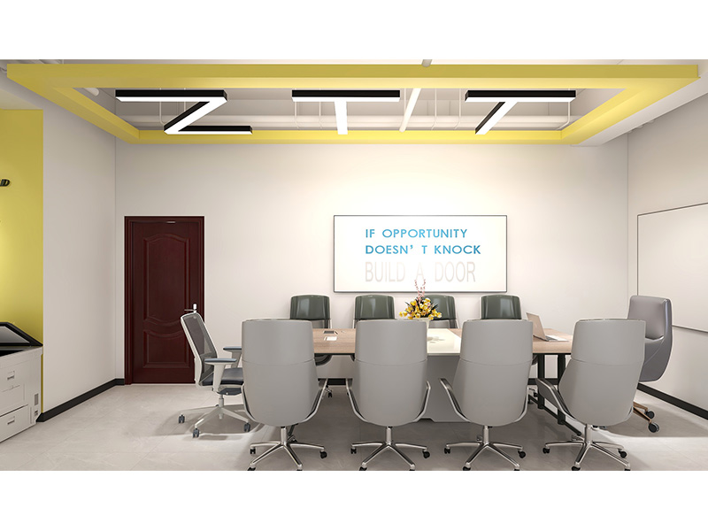 高檔會議室頂部燈光設計時要在天花板上安裝L型框架,三基色燈一般安裝在會議室天花板上。燈管裝置在L型框架拐角處,使燈光不直接照射到物體及與會者,而依靠天花板對燈光的反射、散射照亮會議室。