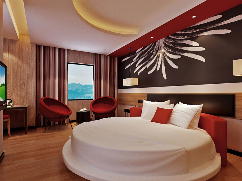 圓床房裝修效果獨(dú)特而浪漫,以圓形為主題設(shè)計(jì)。床頭背景墻采用柔和的色調(diào)與溫馨材質(zhì),利用鮮艷的紅色搭配軟包,圓形的床架搭配舒適的床墊與抱枕,不僅視覺(jué)上新穎別致,更提供了全方位的舒適體驗(yàn)。房間內(nèi)燈光設(shè)計(jì)柔和,通過(guò)壁燈、臺(tái)燈以及可調(diào)光的主燈,營(yíng)造出浪漫溫馨的氛圍,讓情侶們共度美好時(shí)光。整體裝飾簡(jiǎn)潔而不失精致,每一處細(xì)節(jié)都透露著對(duì)浪漫與舒適的追求。